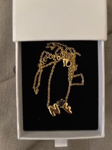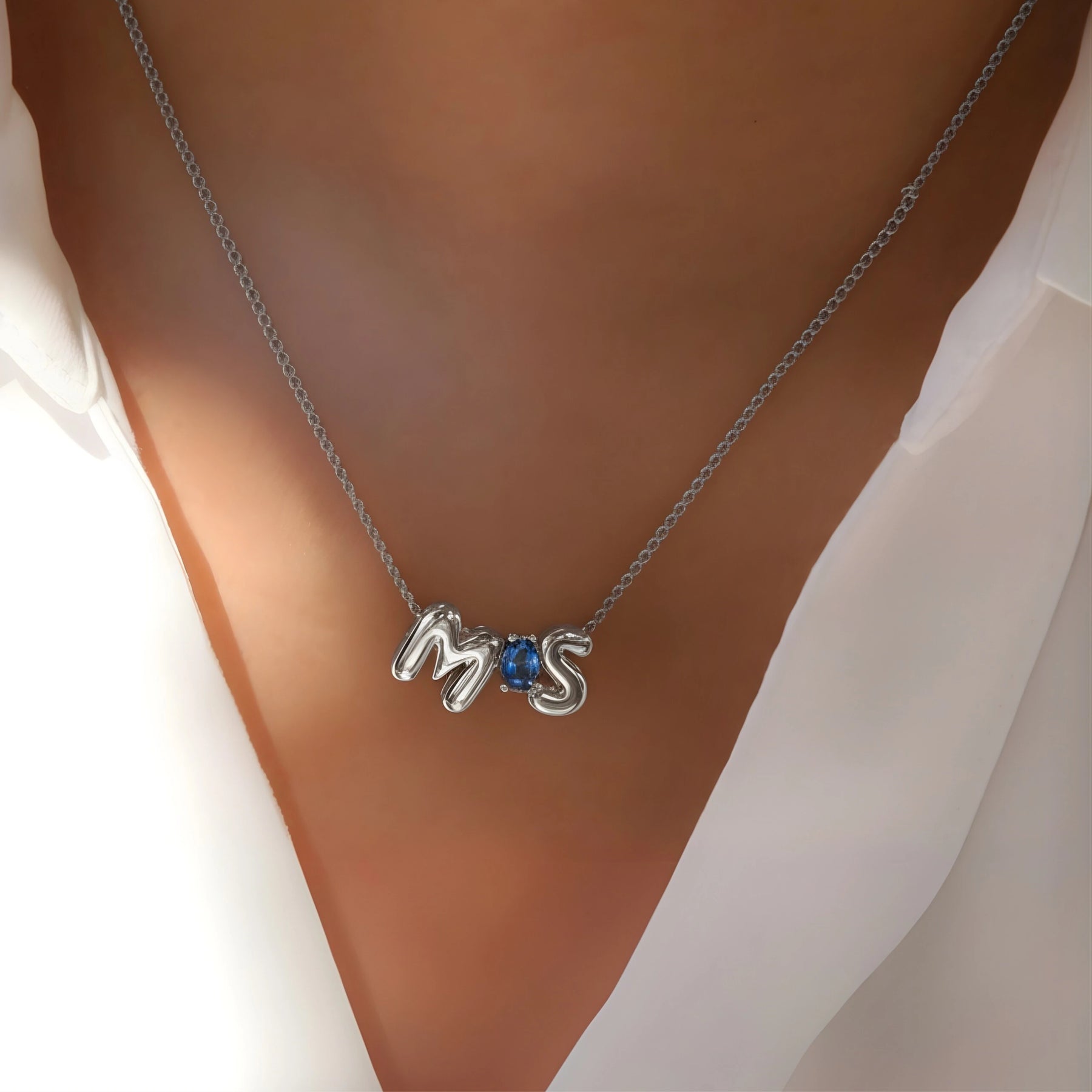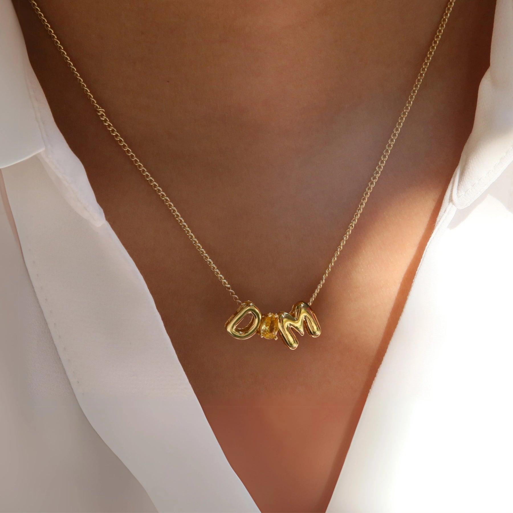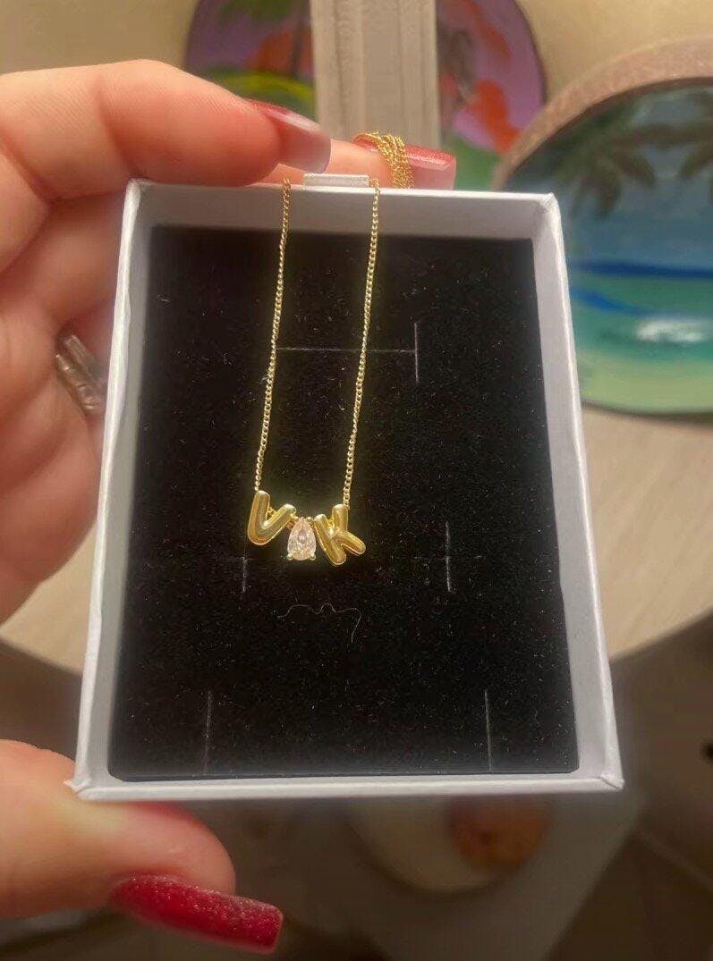 Collar de iniciales bubble personalizado con piedra de aniversario. Fabricado en acero inoxidable quirúrgico 316L y disponible en chapado de oro o plata.